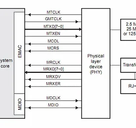 10/100Mbps 의 이더넷칩에는 의례희 MAC 과 PHY 가 하나의 칩에 들어간다. 하지만 Gigabit 이더넷이 되면 MAC 과 PHY 가 분리된다. MAC 은 순수한 1,0 데이타를 말하며 PHY 를 이비트들을 전기적이 신호성분으로 변경하는 부분을 말한다. 참고로 PHY에서 4B/5B 엔코딩,디코딩을 실행한다. (4B/5B 엔코딩은 4비트를 5비트로 확장하는 엔코딩이다.) MII (Media Independant Interface) TXD[0..3], RXD[0..3], REF_CLK, TX_EN, RX_ERR, CRS, MDIO, MDC 이정도의 신호선이 있다. 데이타버스가 4bit 이므로 클럭은 25MHz 이다. (그래야 100Mbit 를 전송할수 있다.) RMII 는 MII 인터페이스의 라인..